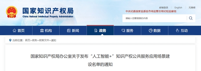 国家知识产权局办公室关于发布“人工智能+”知识产权公共服务应用场景建设名单的通知