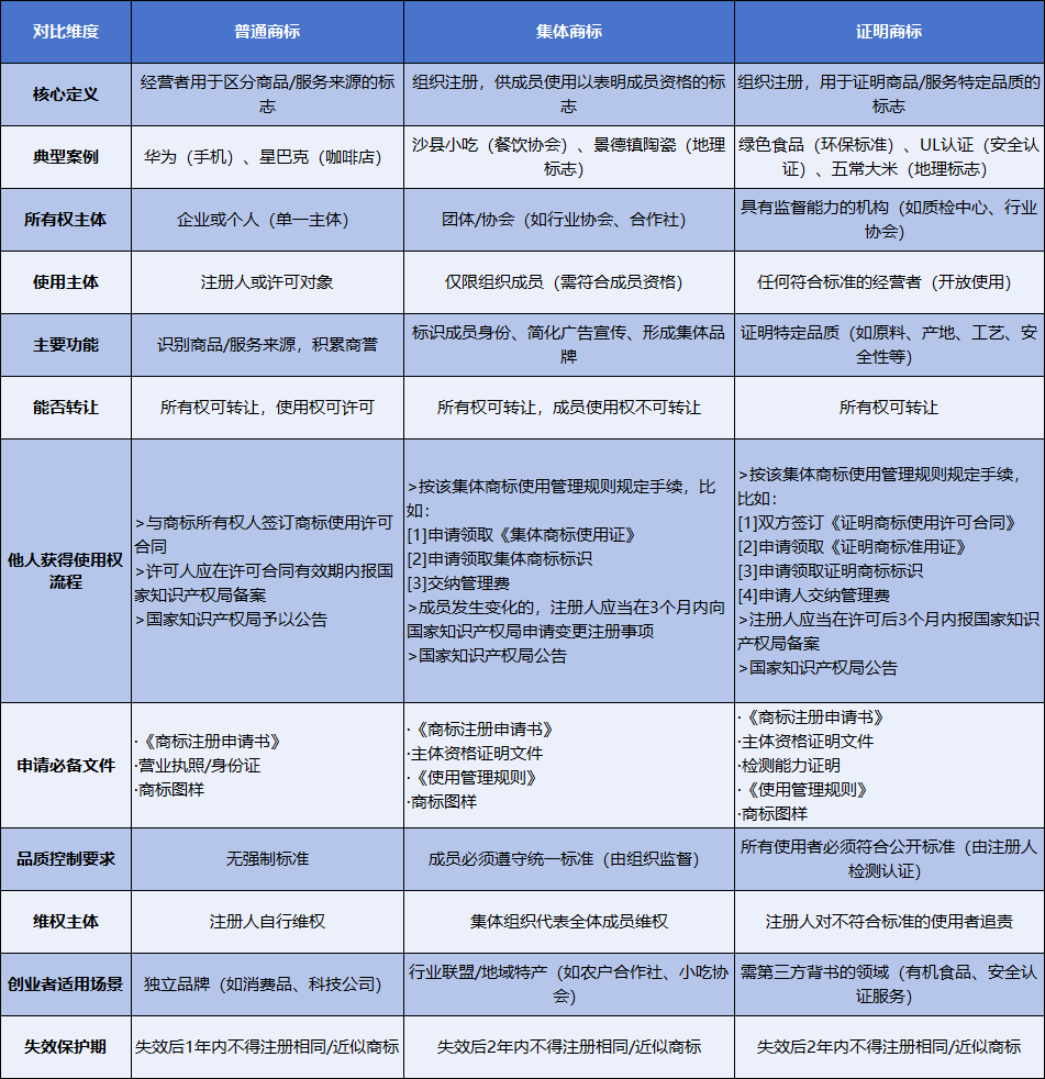 普通商标、集体商标与证明商标的核心区别对比表,涵盖权利主体、使用范围、法律功能、申请要求等关键维度: